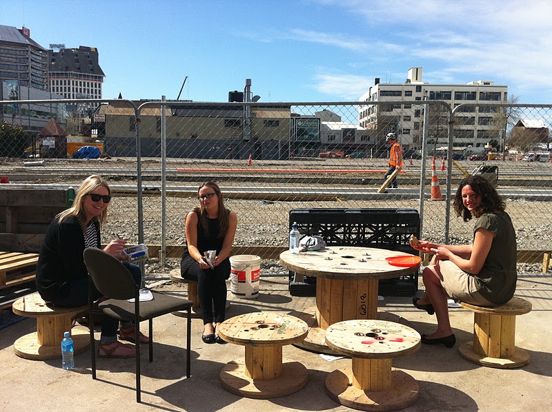This is the current tea nook (that's what the Council peeps call a tea room) at CCC's new digs: the REXEL Warehouse. You know...sitting outside a converted warehouse that holds 800 of us, whilst we wait for our Hereford Street building to be repaired to take us back in. I like the positioning of the new 'nook' - right on the edge of the red zone (that space in the photo will soon become the new (take 2) temporary bus terminal. I like it that the construction (well, demolition) ensures we get shaking all day, and I like it that we all think it is completely normal - and the best digs we've had since Feburary! I am continually amused with the adapative powers of humans and our enthusiasm on progress. Each inch helps!